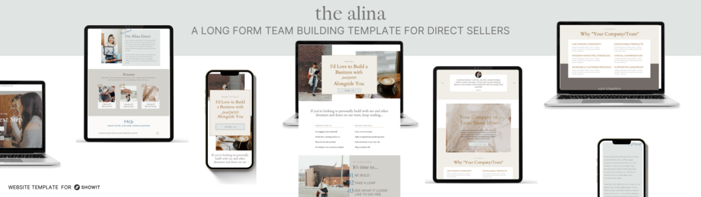 'Alina' is a clean, neutral, and sophisticated Showit website template designed for influencers, entrepreneurs and those is direct sales/network marketing. This sales page is designed specifically for direct sellers to lead people through a process to join their downline.